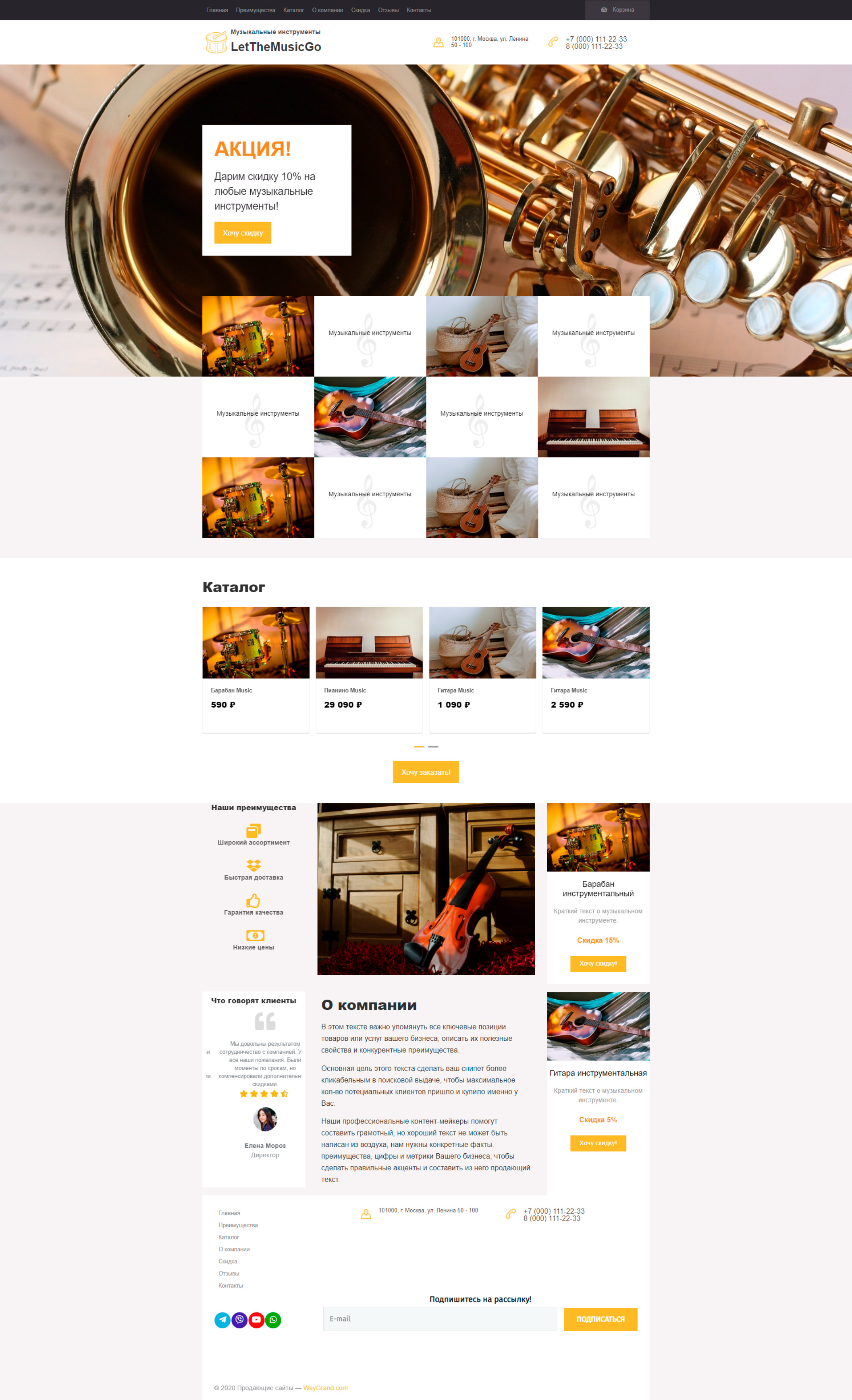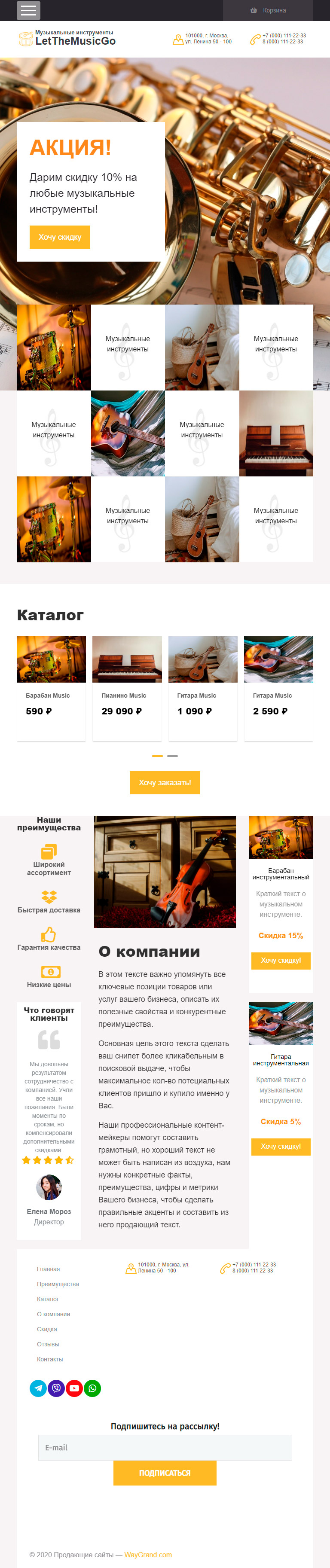 Закажите готовый продающий сайт лендинг #0710201 в Рязани за 1-3 дня «под ключ»: свёрстан, отрисован и готов к рекламе. Тематика шаблона «Музыкальные инструменты».
